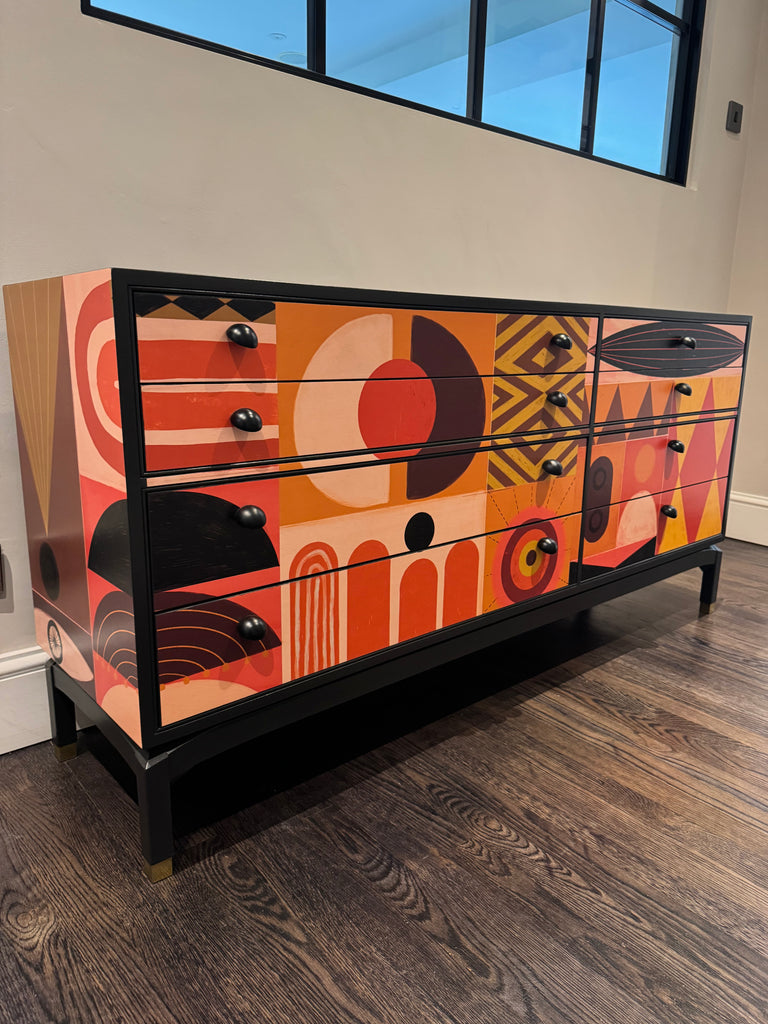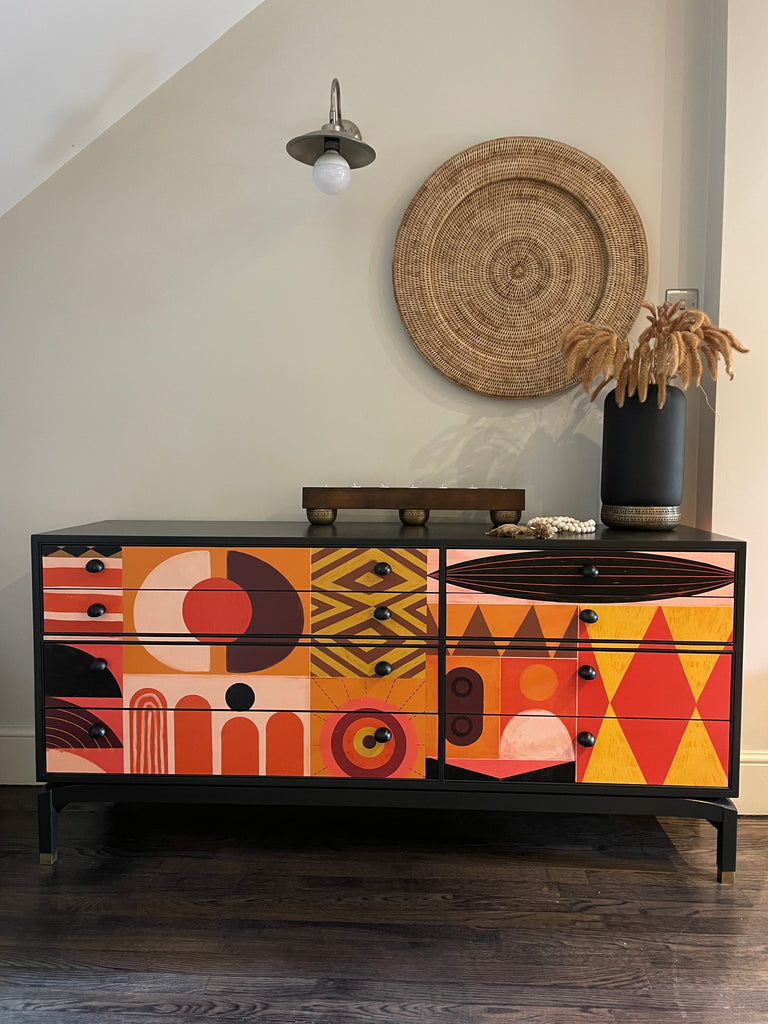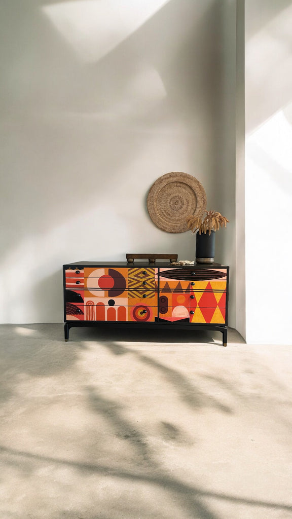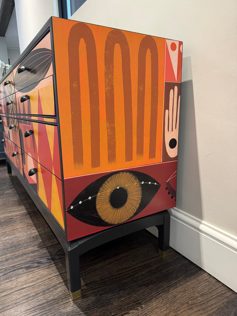 Manufactured in the 1960s, this 8 drawer storage sideboard is not only eye-catching but it's bespoke. There isn't another one like this beauty. It's been expertly decoupaged in a stunning mural by Victoria Topping (check out her art on her website!) and has hand-painted in warm and rich colour called cast iron by Fusion Mineral Paint. Top quality Dowsing & Reynolds matte black brass hardware has been added to 'top' off the retro vibe (...see what I did there?).